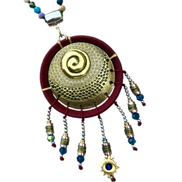 Materiales: pewter con chapa en acabado viejo, cuentas de cristal multicolor, hilo textil y aplicaciones metálicas.