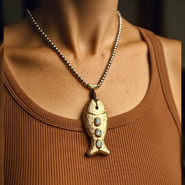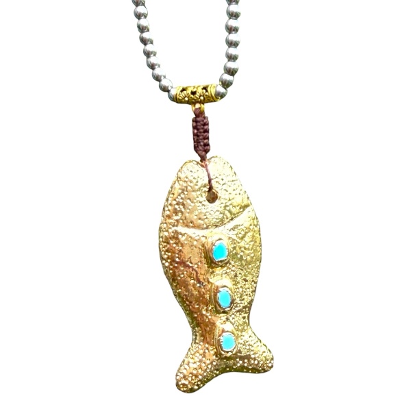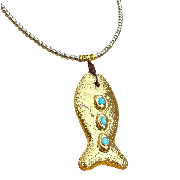 Elegante collar con dije de pez en pewter con chapa de 14k y turquesas incrustadas, símbolo de abundancia y buena fortuna.